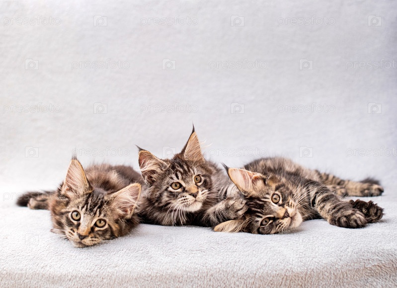 Семья мейнкунов, три котенка, лежат на легком пушистом одеяле