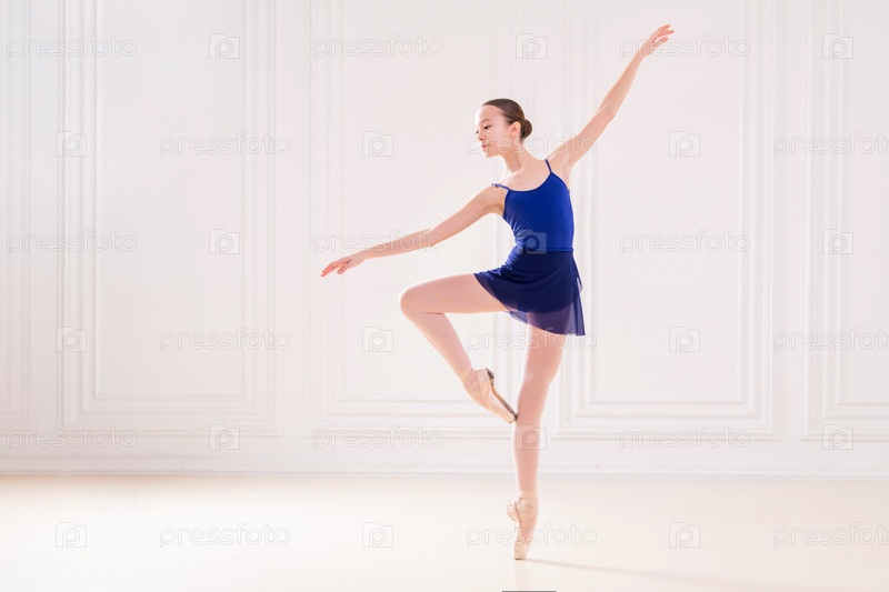 Профессиональная студенческая балерина делает пуанты в красивой белой комнате