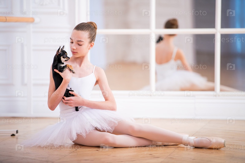 Молодая стройная балерина в белой пачке сидит на полу с крошечной чихуахуа в руках в красивой белой комнате перед зеркалом