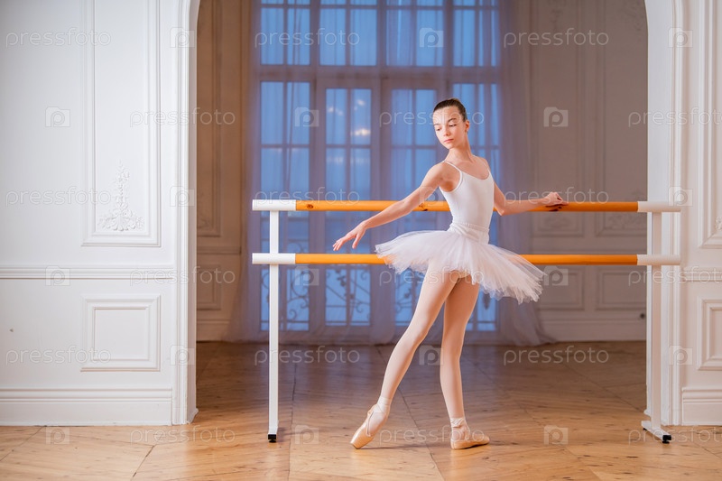 Молодая стройная балерина в белой пачке делает пуанты в балетном баре в красивом белом зале перед зеркалом