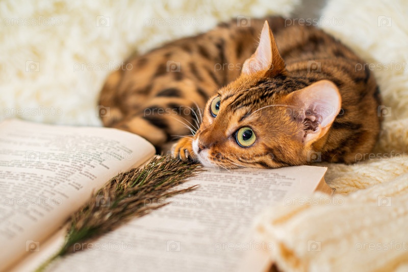 Бенгальский котенок лежит рядом с книгой на вязаном свитере в уютной атмосфере