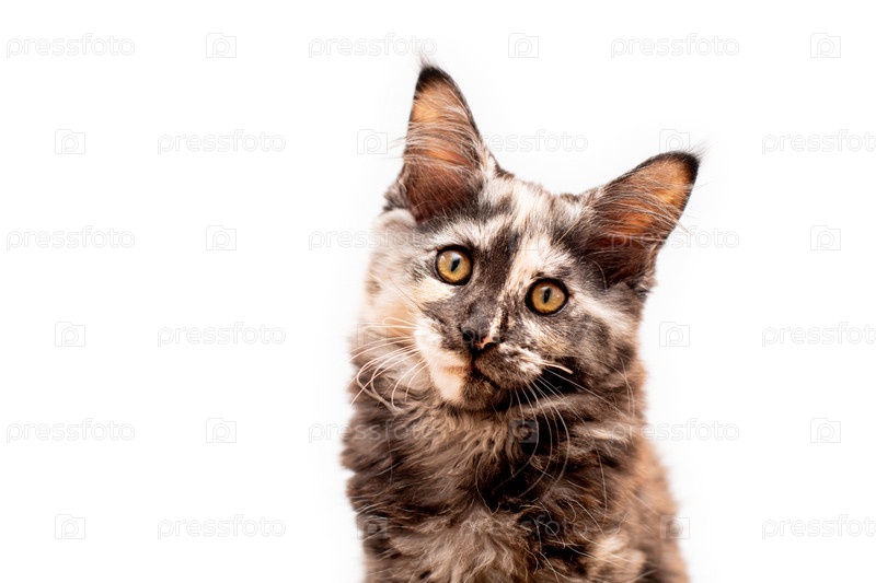 Морда коричневая черепаховая кошка мейн кун смотрит прямо, изолированная на белом фоне