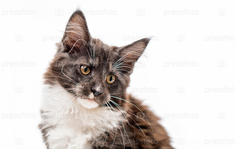 Выразительный серебристый котенок Мейн Кун сидит лицом вперед. Изолированный белый фон. Выразительный серебристый котенок Мейн Кун сидит лицом вперед. Изолированный белый фон