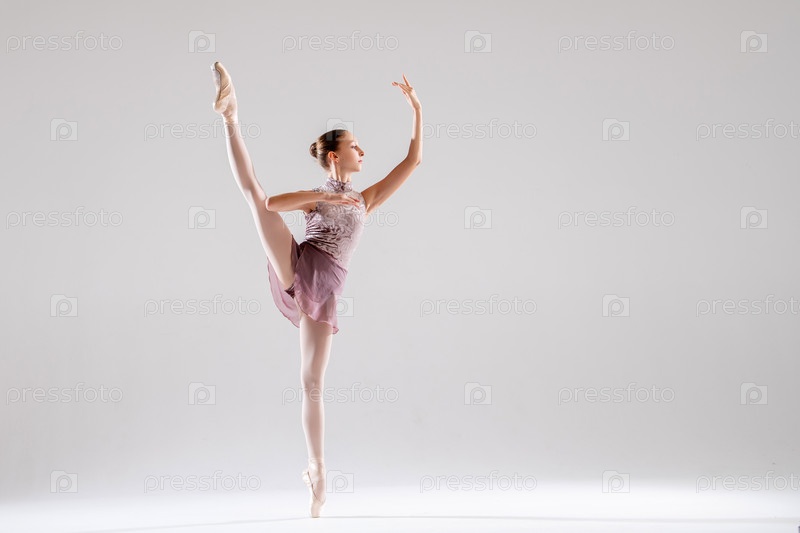 Красивая молодая балерина в пуантах и розовом купальнике на светлом фоне