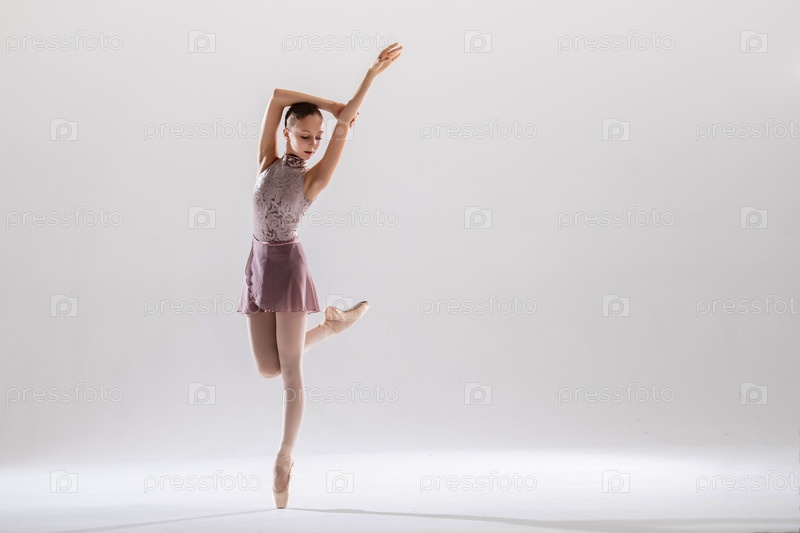 Красивая молодая балерина в пуантах и розовом купальнике на светлом фоне