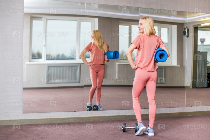 Радостная блондинка со свернутым в рулон ковриком в спортзале на тренировке