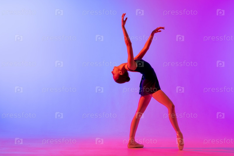 Красивая молодая девушка-балерина в пуантах и розовом силуэте купальника на ярко-синем фоне