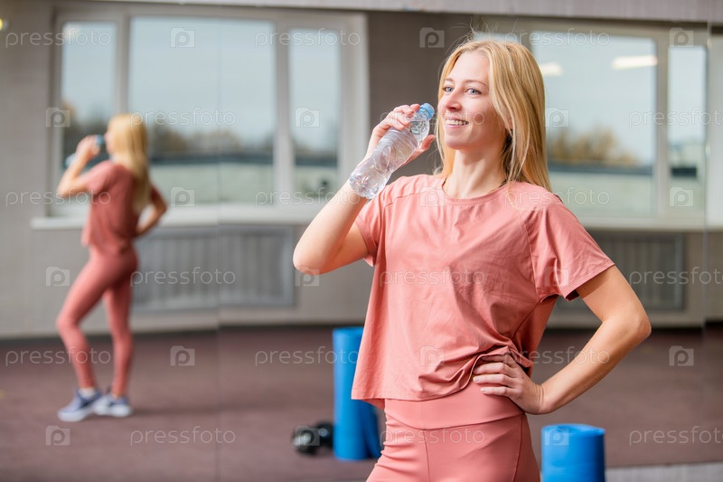 Радостная блондинка пьет воду из пластиковой бутылки в спортзале во время тренировки