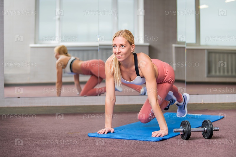 Улыбающаяся блондинка делает упражнения на коврике в тренажерном зале