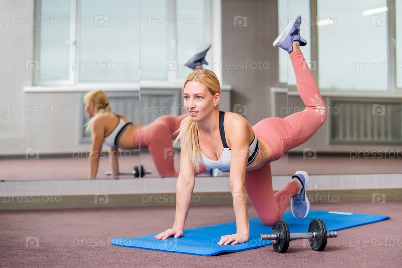 Улыбающаяся блондинка делает упражнения на коврике в тренажерном зале