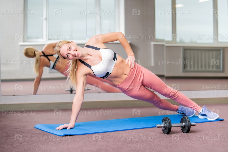 Улыбающаяся блондинка делает упражнения на коврике в тренажерном зале
