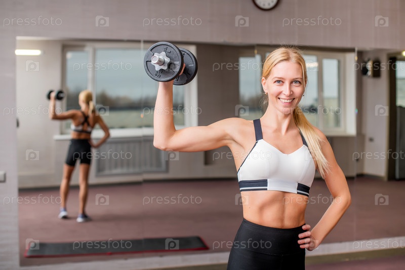Улыбающаяся блондинка делает упражнения с гантелями в тренажерном зале