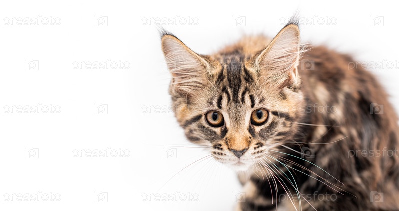 Выразительный удивленный серый котенок Мейн Кун сидит лицом вперед. Изолированный белый фон