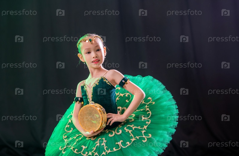 Маленькая балерина танцует на сцене в пачке на пуантах с бубном, классическая вариация Эсмеральды