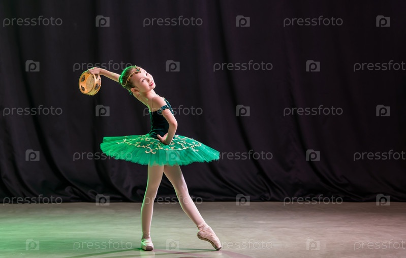 Маленькая балерина танцует на сцене в пачке на пуантах с бубном, классическая вариация Эсмеральды