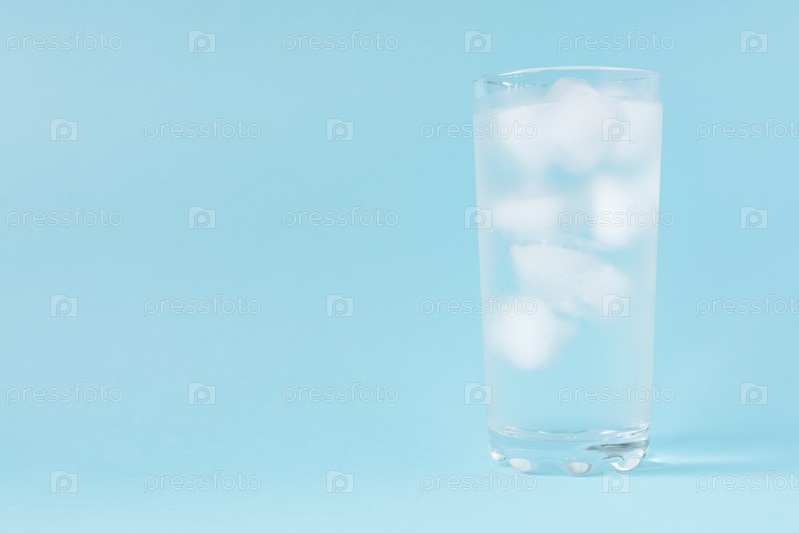 Крупный план чистой воды со льдом в высоком прозрачном стекле с копировальным пространством на синем фоне