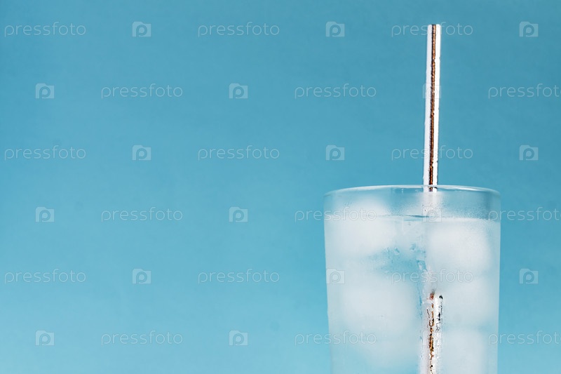 Крупный план чистой воды со льдом и серебряной бумажной соломой в высоком прозрачном стекле и солнечными бликами на синем фоне. Копировать пространство