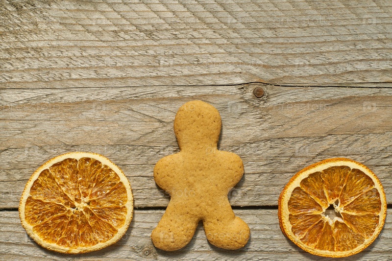 Вид сверху сушеных ломтиков апельсина и имбирного хлеба на деревянном фоне. Праздничная рождественская открытка с копией пространства для ваших проектов