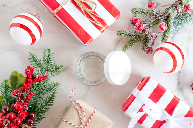 Рождественский спа-концепт и зимние продукты по уходу за кожей, еловые ветки и подарочные коробки на мраморном фоне, плоская планировка, пространство для копирования. Сезонная рутина красоты и концепция ухода за кожей