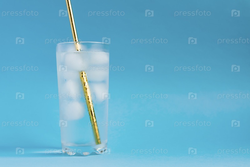 Крупный план чистой воды со льдом и золотой бумажной соломой в высоком прозрачном стекле и солнечными бликами на синем фоне. Копировать пространство