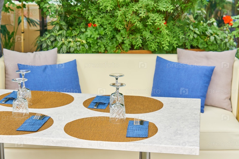 Уличное кафе. Диван с синими и серыми подушками и стол с вилками и бокалами