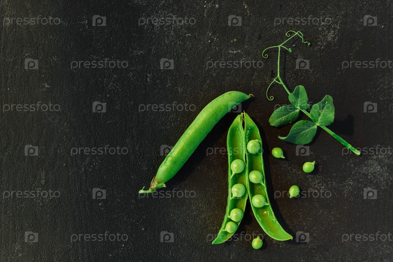 Овощной фон с копией пространства для ваших проектов. Крупный план свежего спелого зеленого горошка на черном фоне