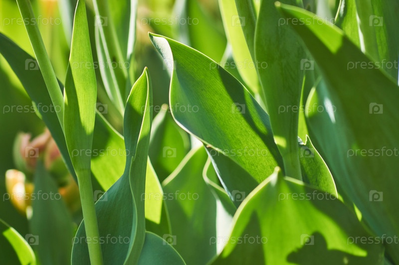 Зеленый тюльпан оставляет фон. Пышное веселье в весеннем саду