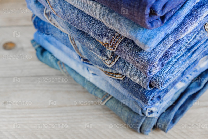 Стопка синих джинсов на деревянной полке с копией пространства. Концепция красоты и модной одежды, выборочный фокус