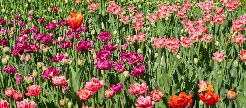 Красивые розовые и фиолетовые поля тюльпанов весной, естественный фон, баннер