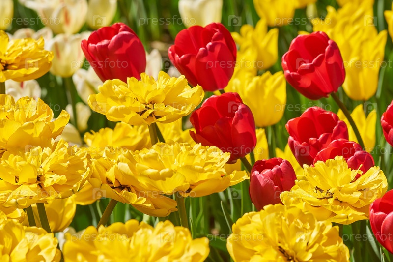 Красивые поля красных и желтых тюльпанов весной, естественный фон