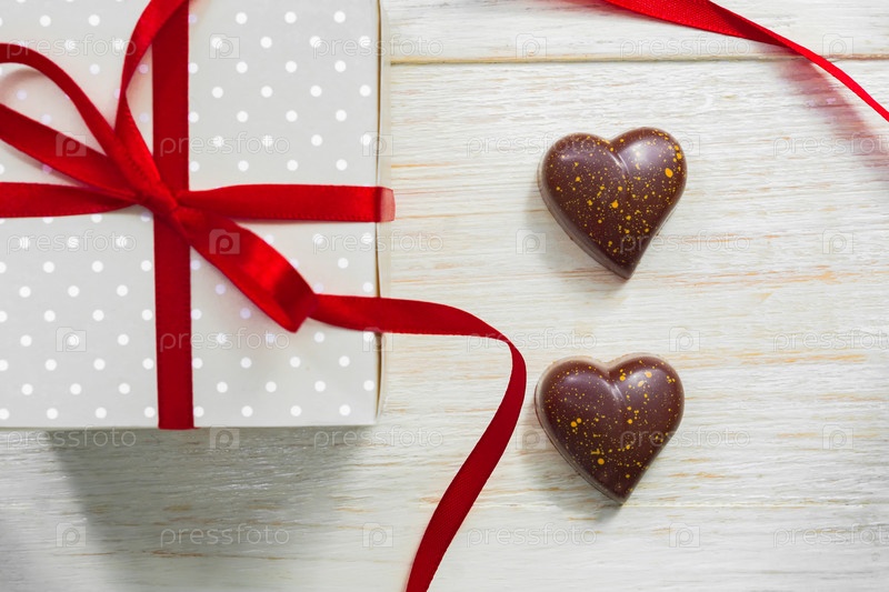 Открытка на день святого валентина. Шоколадные конфеты в форме сердца и подарочная коробка с красной праздничной лентой на деревянном фоне