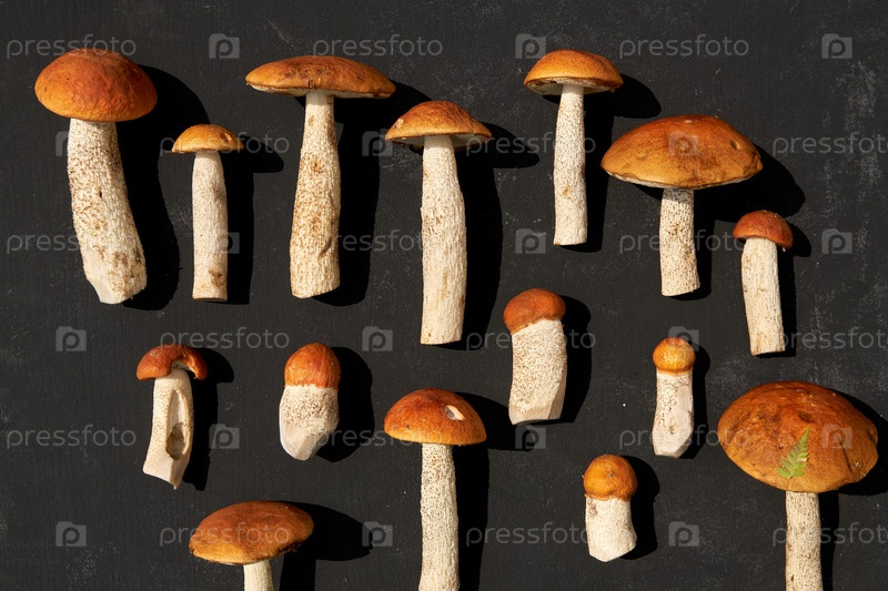 Подберезовик Оранжевые грибы в ряд на темном фоне. Концепция природы, окружающей среды и съедобных грибов с копировальным пространством. Вид сверху, плоская планировка