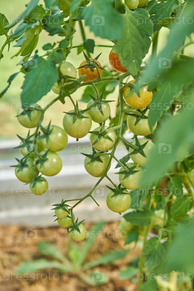Органическая плантация созревающих помидоров черри. Веганская здоровая и диетическая еда от природы