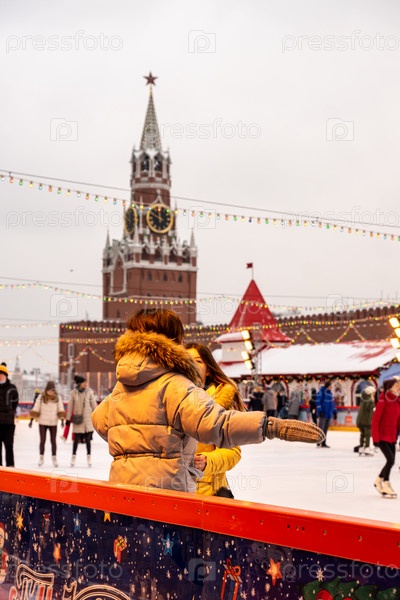МОСКВА, РОССИЯ - 15 ДЕКАБРЯ 2020 г.: Кремлевская площадь, каток возле Кремля. Любимое место для проведения зимних каникул в Москве