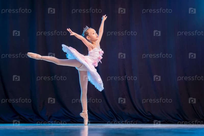 Маленькая балерина танцует на сцене в белой пачке на пуантах - классический вариант