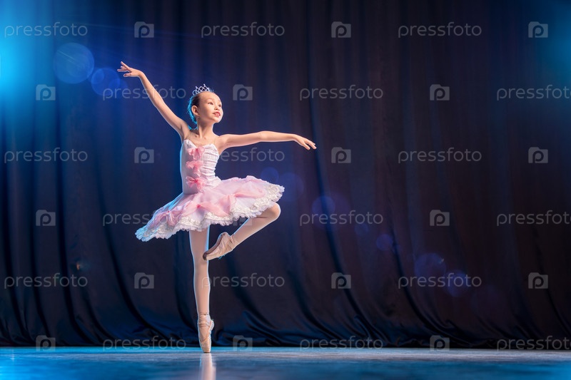 Маленькая балерина танцует на сцене в белой пачке на пуантах - классический вариант