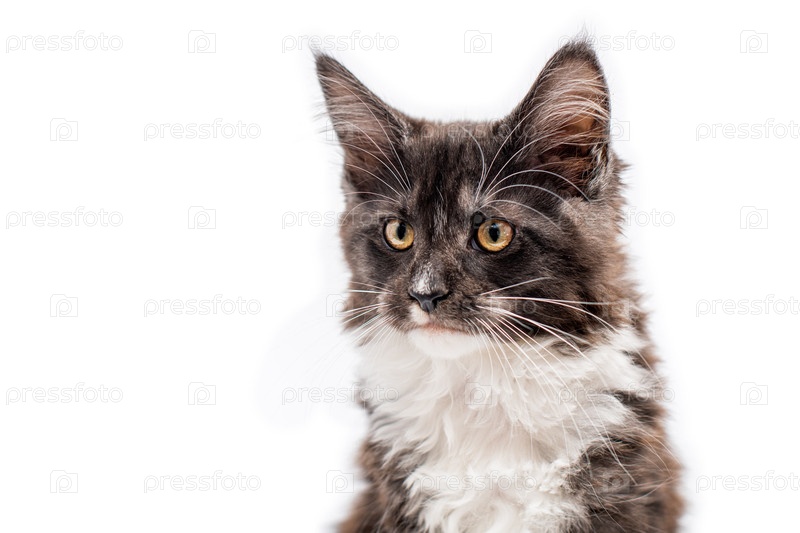 Выразительный серебристый котенок Мейн Кун сидит лицом вперед. Изолированный белый фон. Выразительный серебристый котенок Мейн Кун сидит лицом вперед. Изолированный белый фон