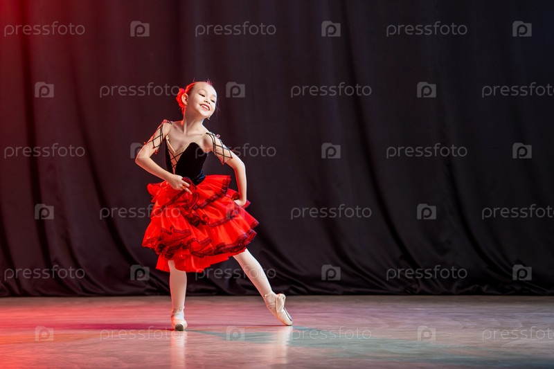 Маленькая балерина танцует на сцене в балетной пачке на пуантах с кастанедами, классической вариацией Китри