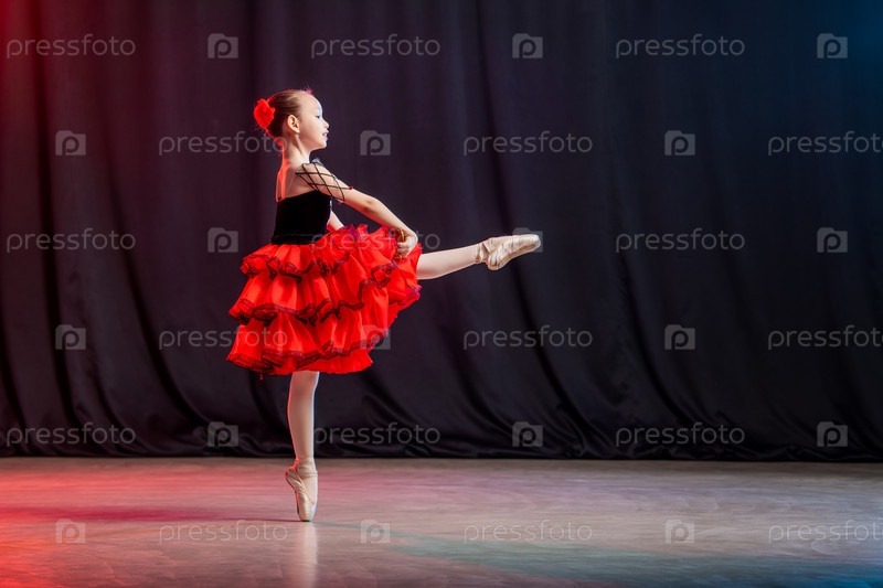 Маленькая девочка-балерина танцует на сцене в пачке на пуантах с кастанедасом, классической вариацией Китри