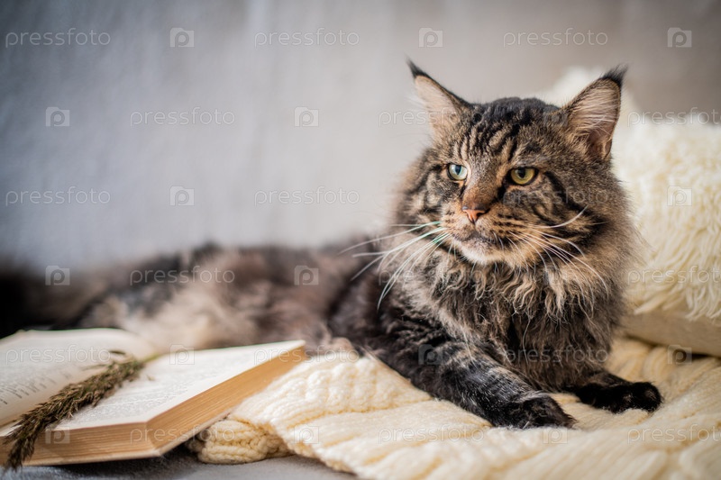 Жестокий кот мейн-кун лежит рядом с книгой на вязаном свитере в уютной атмосфере