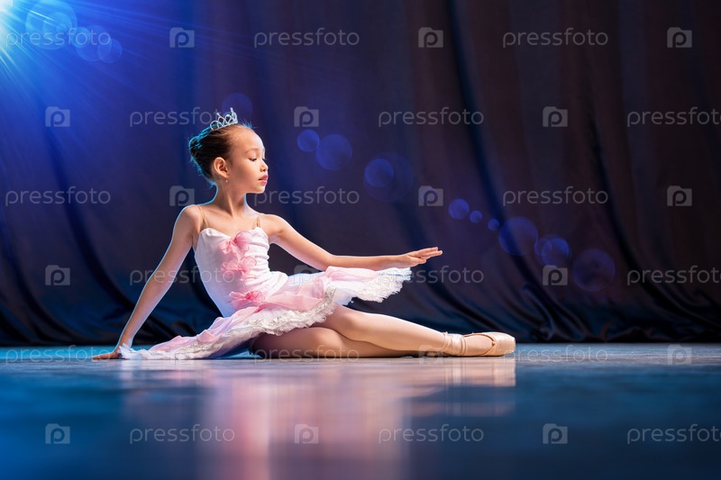 Маленькая девочка-балерина танцует на сцене в белой пачке на классических вариациях пуантов