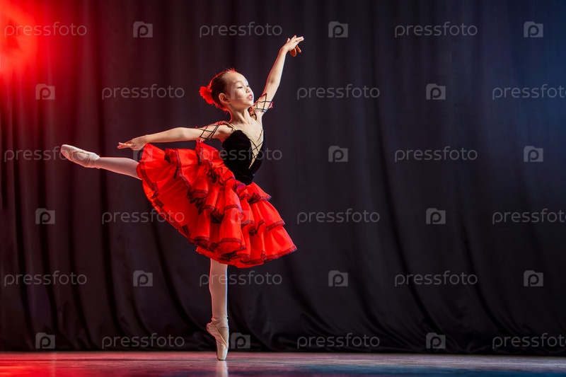 Маленькая девочка-балерина танцует на сцене в пачке на пуантах с кастанедасом, классической вариацией Китри