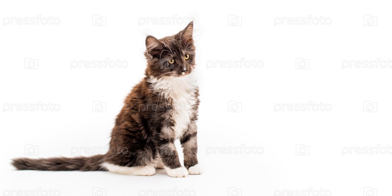 Выразительный серый котенок мейн-кун с белым нагрудником сидит лицом вперед. Изолированные на белом фоне