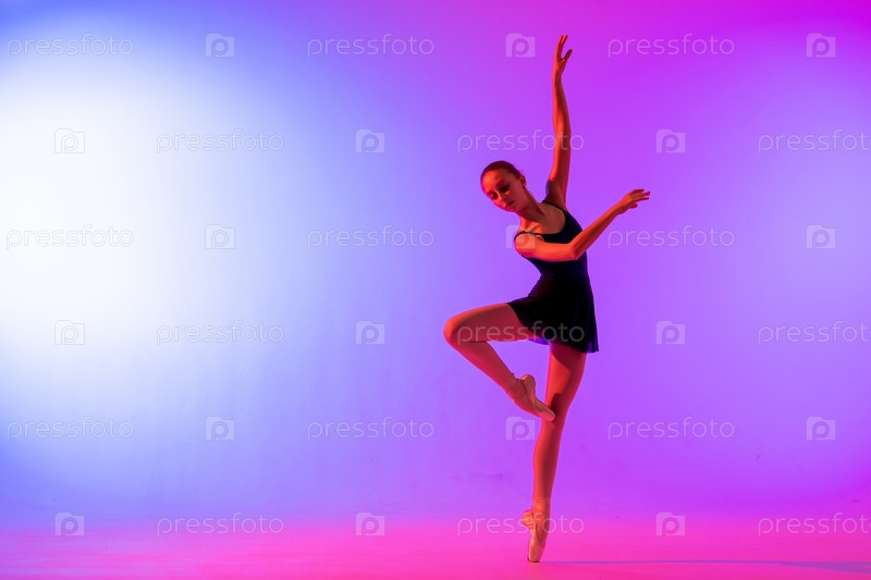 Красивая молодая девушка-балерина в пуантах и розовом силуэте купальника на ярко-синем фоне