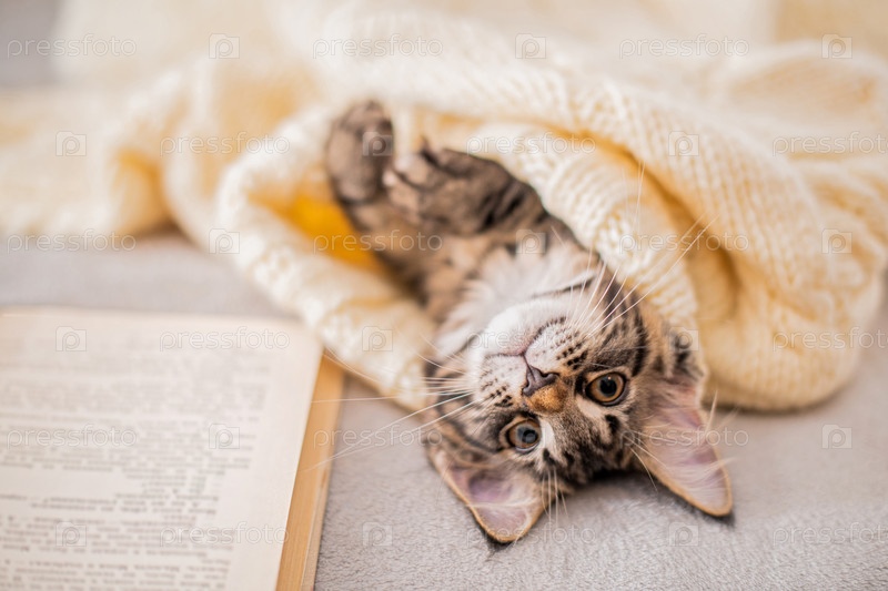 Котенок Мейн Кун лежит на книге под вязаным свитером в уютной атмосфере