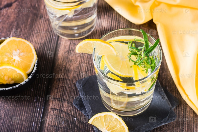 Кусочки лимона в стакане воды и розмарина на деревянном столе. Детокс напиток