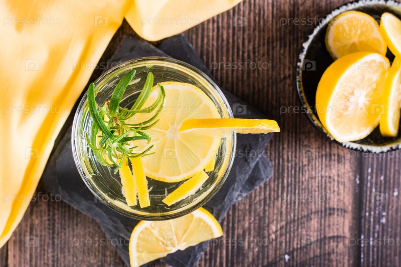 Вода с лимоном и розмарином в стаканах на столе. Детокс напиток. Вид сверху. Крупный план