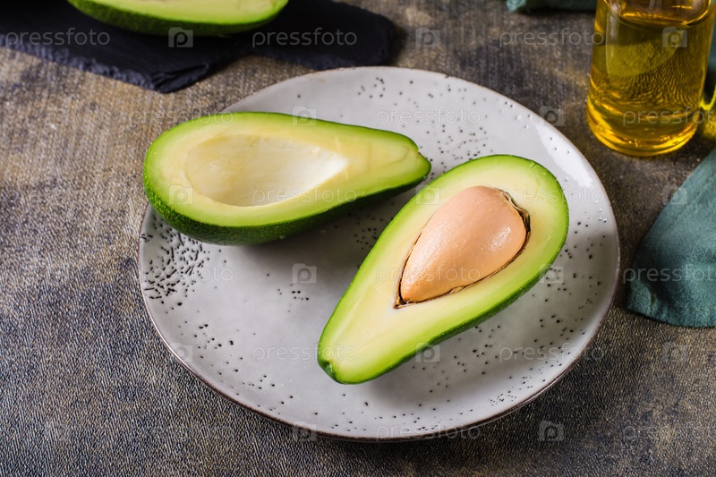 Половинки авокадо на тарелке на столе. Здоровое витаминное питание