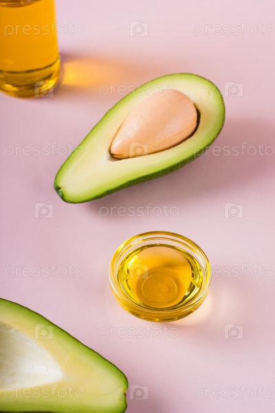 Спелый авокадо и масло авокадо в миске и бутылке. Домашняя косметика. Вертикальный вид
