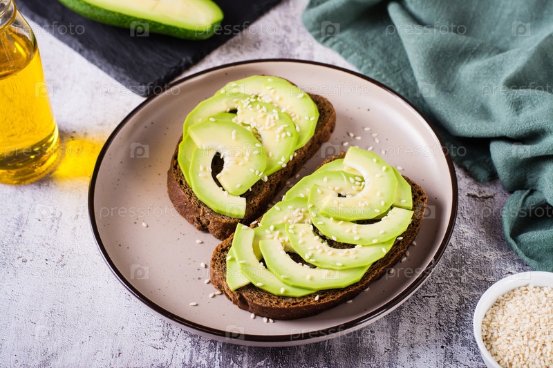 Брускетта с авокадо и кунжутом на ржаном хлебе на тарелке. Здоровая пища